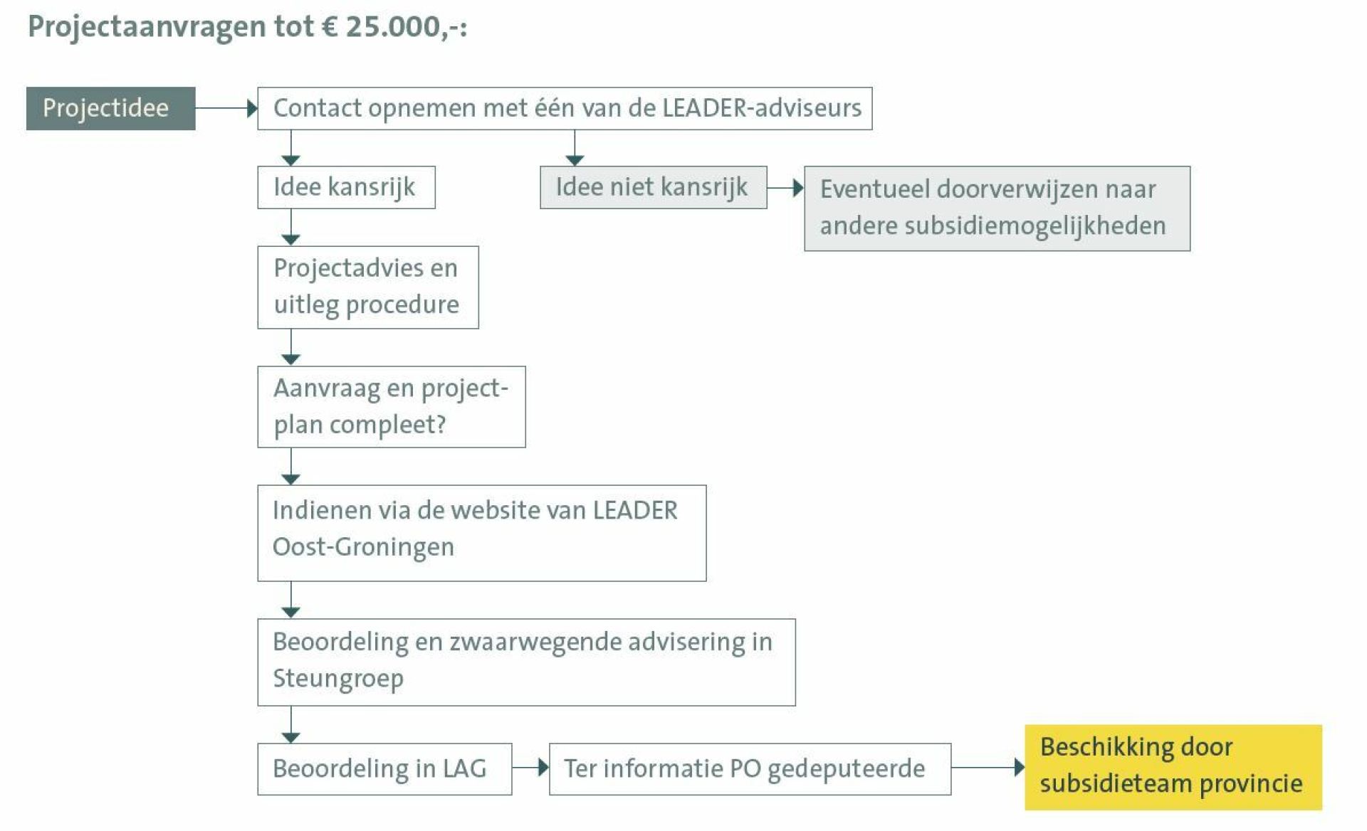 Alleen complete projecten worden door de LAG beoordeeld. De projectaanvragen moeten worden voorzien van een aanvraagformulier en het projectplan moet voldoen aan de Leidraad projectomschrijving: bekijk Leidraad. De LAG beoordeelt de projecten aan de hand van een beoordelingsformulier met daarin de selectiecriteria, voorzien van een wegingsfactor/puntentelling.