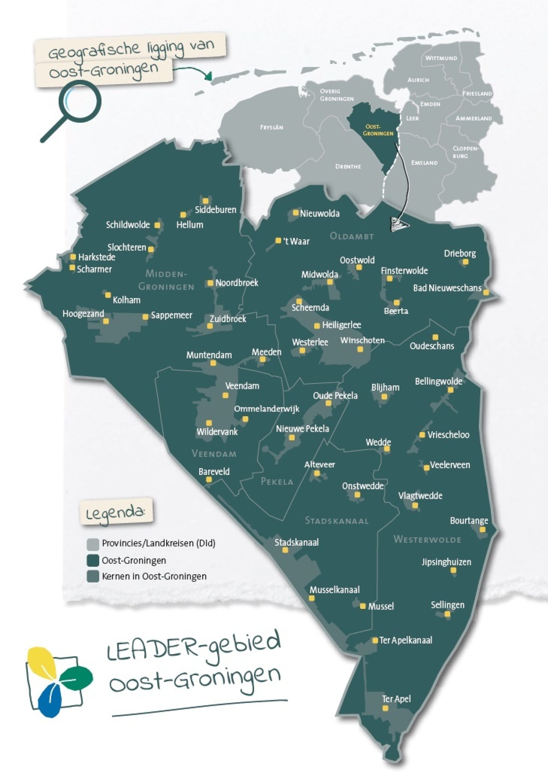 Deze gemeenten en landschappen vormen samen het LEADER-gebied Oost-Groningen. Het gebied is (voor Nederlandse begrippen) geografisch gezien groot. De gemeenten hebben grote overeenkomsten, maar kennen ook onderlinge verschillen. De gebieden zijn echter wel nauw verbonden. Elke subregio heeft een grotere kern waarin het voorzieningenaanbod van de subregio ligt. Binnen het gebied bestaan er diverse samenwerkingsverbanden, zowel tussen bijvoorbeeld corporaties, zorgpartijen, onderwijsinstellingen en het bedrijfsleven, als op gemeentelijk niveau. Het gaat daarbij voor een groot deel ook om thema’s die aansluiten bij waar wij ons in de LOS op richten: Economie, landbouw en toerisme, sociale cohesie en gezondheid en klimaat, duurzaamheid en landschap.
